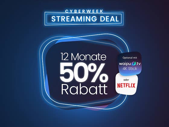 Es gibt auch die Netflix-Varianten „Standard“ und „Premium“ im Aktionszeitraum zum halben Preis, und auch das Kombi-Angebot „waipu.tv 4K Stick inklusive Perfect Plus“ könnt Ihr für schlappe acht Euro abstauben. Wer sich bis einschließlich 27.11. für ein waipu.tv-Abo entscheidet, kann in Summe bis zu 176 Euro sparen!