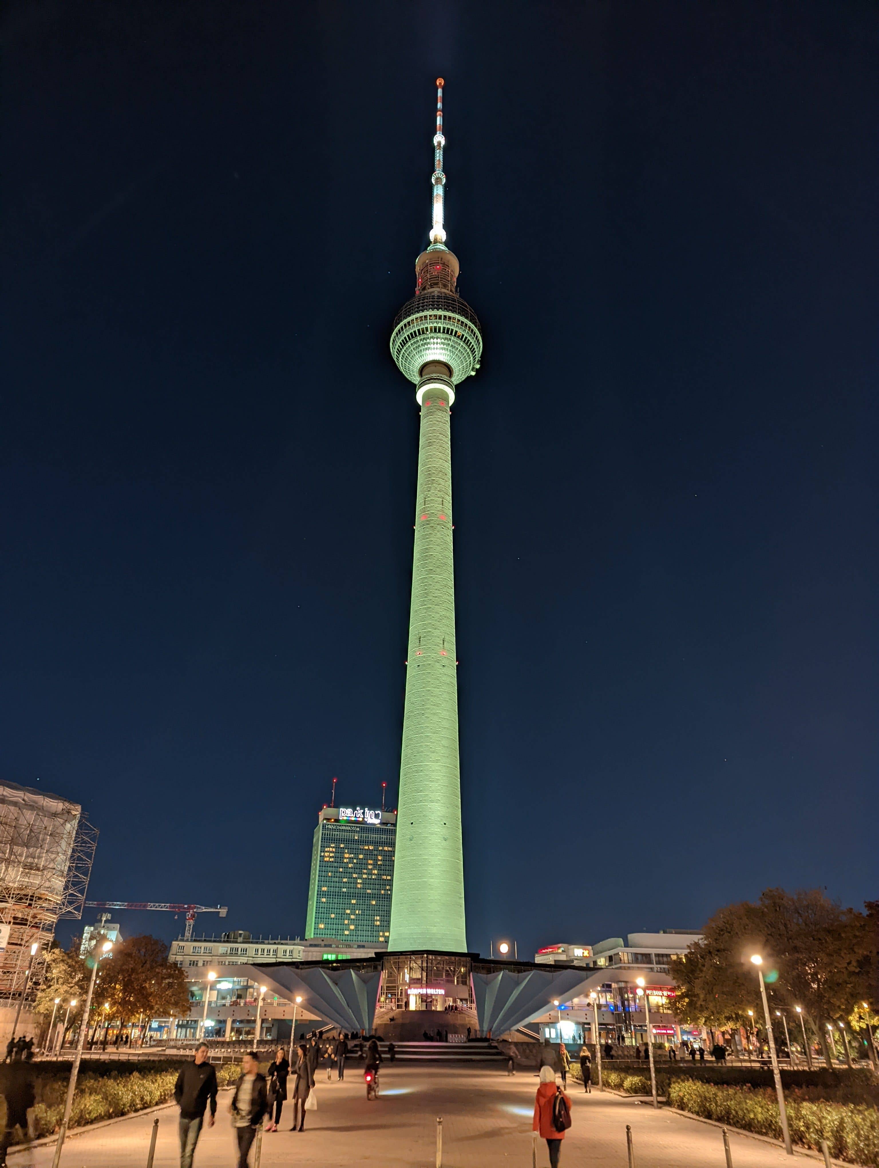 Schaut man sich die Fotos vom Fernsehturm an, kann man im ersten Moment von dem Kran links beim Pixel viel mehr erkennen. Schaut man dann unten auf den Fußweg, dann sieht das aus wie Samsung, eigentlich viel schlimmer. Das ist nur eine verschmierte Fläche – einfach katastrophal. Das können andere aber besser – und ich meine, das kann das nichtgeupdatete Pixel 5 auch besser.