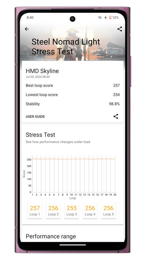 In den Benchmark-Tests lag das HMD Skyline gleichauf mit dem Poco X6, das wir vor ein paar Wochen getestet haben und das von demselben Chip angetrieben wird. Der einzige Unterschied war eine stabilere Leistung im 3DMark-Stresstest, bei dem die Leistung nicht gedrosselt wurde, aber das Handy fühlte sich etwas heiß an.