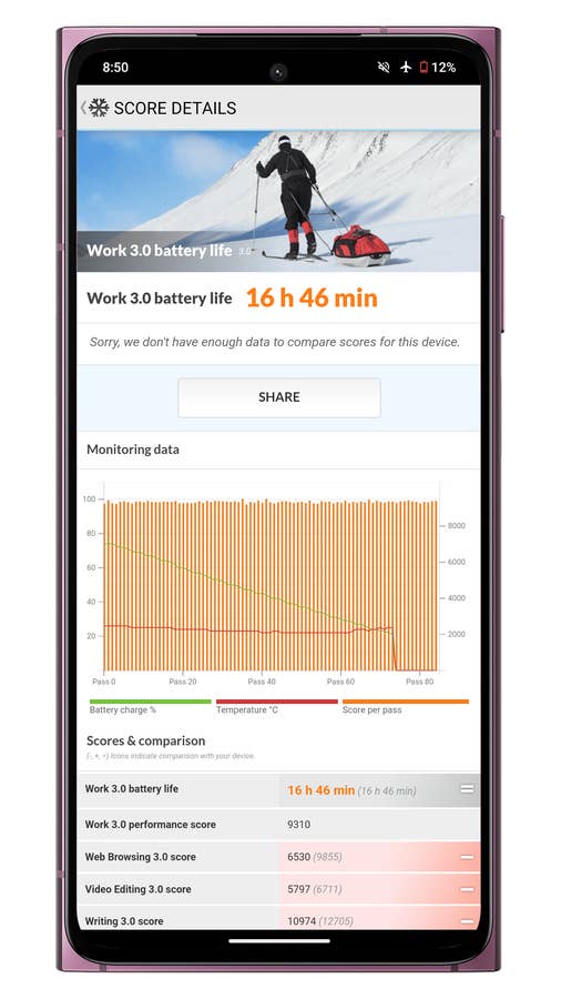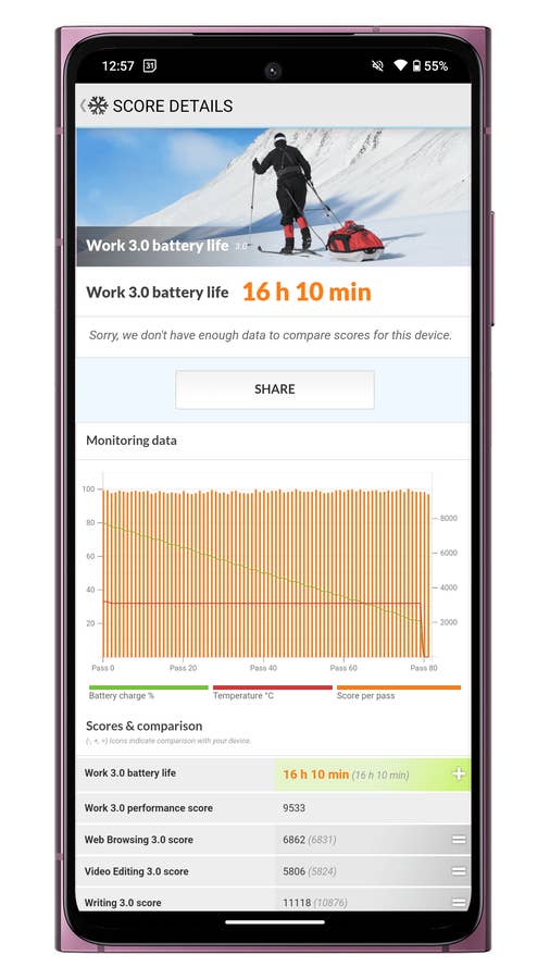 Es ist erwähnenswert, dass das Leistungsniveau bei diesen Tests deutlich niedriger war als beim Poco X6 mit demselben Chip, das ein eher niedriges Ergebnis von 11h23 erzielte. Es scheint also, dass das Skyline die Leistung gedrosselt hat, um eine bessere Laufzeit zu erreichen.