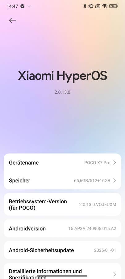 Zum Zeitpunkt der Markteinführung läuft die Software auf Android 15 und und hat den Sicherheitspatch von Januar während unseres Tests per Update erhalten. Somit ist das Smartphone auf dem neuesten Stand. Allerdings gibt es keine offizielle Update-Garantie, und insbesondere die essenziellen Sicherheitsupdates wurden bei früheren Xiaomi-Smartphones häufig verspätet und unregelmäßig bereitgestellt. Hier besteht noch Verbesserungsbedarf.