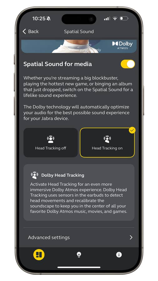 Jabra erklärt jedoch, dass sie ihre Algorithmen für Spatial Audio gründlich überarbeitet haben. Diese Funktion nutzt Dolby Atmos und Kopfverfolgung. Dieses Tracking ist ziemlich effektiv und erfordert nicht, dass man ein Foto von seinen Ohren machen muss, wie bei Apple.