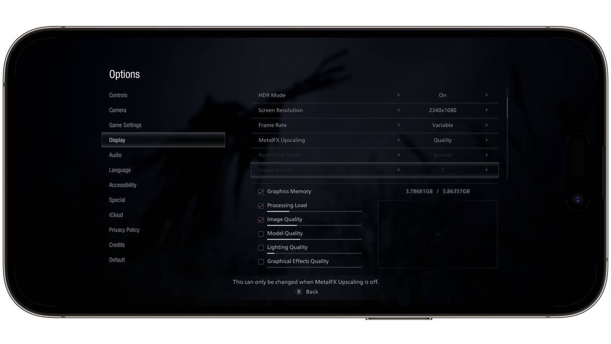 Im Menü des Spiels findet Ihr zudem eine Anzeige, die Euch verrät, wie viel RAM das Spiel maximal ausnutzen kann. Bei meinem Playthrough war ich bei 3,78681 GB von 5,86332 GB möglichem Arbeitsspeicher. Ja, das iPhone 15 Pro Max hat mehr als 6 GB RAM, ich weiß! Aber das ist einfach die maximale Menge RAM, die das iPhone für dieses Spiel bereitstellt.