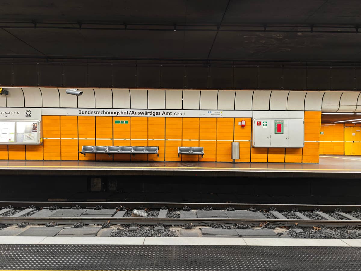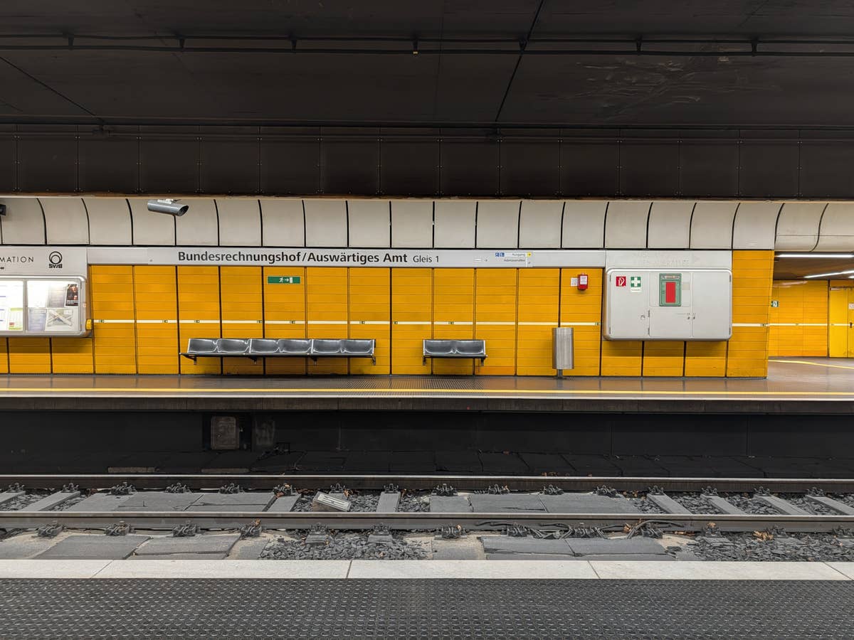 Das grelle Gelb im Neonlicht der Haltestelle und davor die U-Bahn-Schienen in der Dunkelheit. Welches Smartphone fängt die Situation am besten ein?