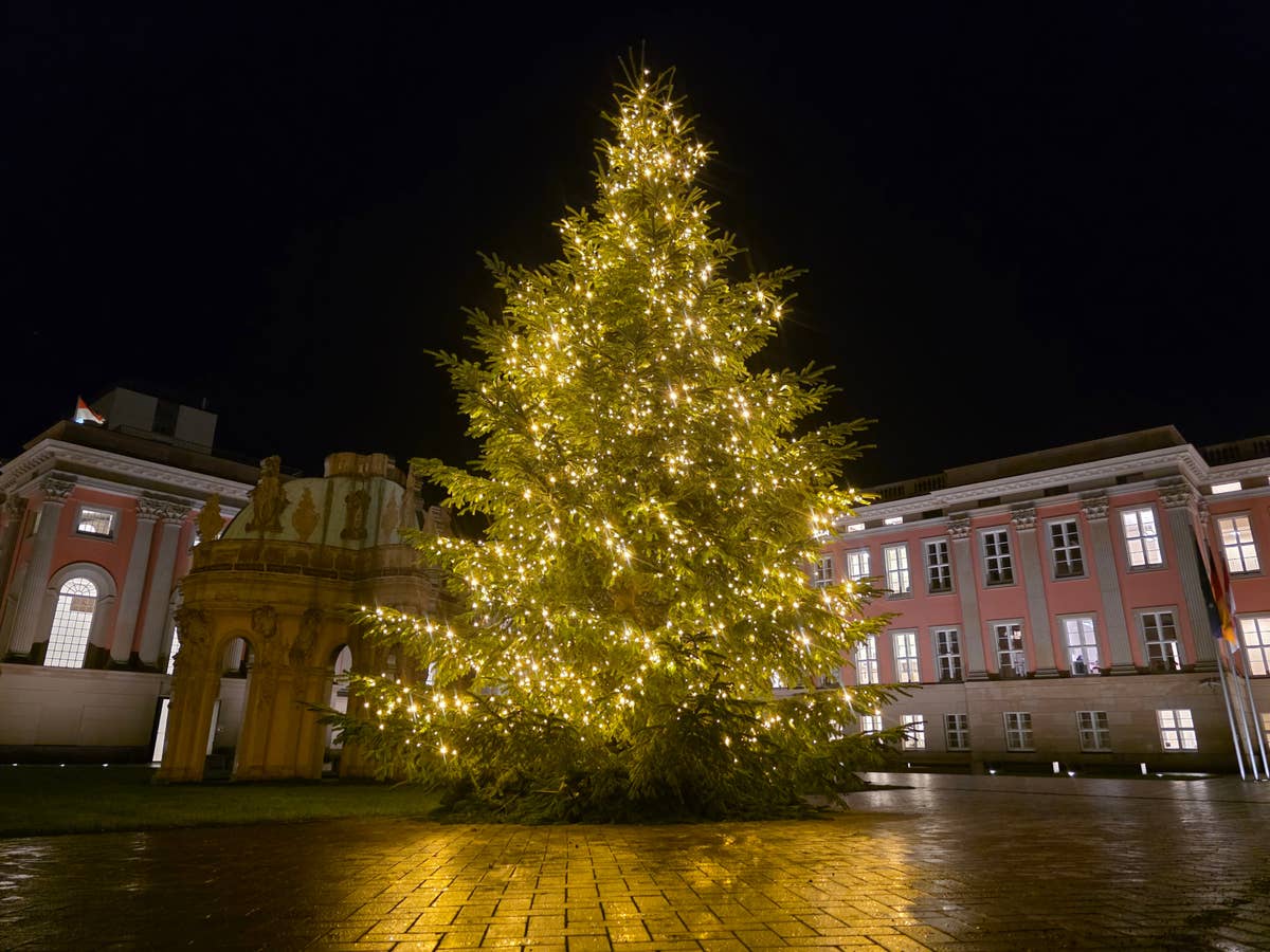 Ein Foto bei Nacht darf in dem Kamera-Blindtest auf keinen Fall fehlen. Hier passend zur Jahreszeit mit leuchtendem Weihnachtsbaum, Reflexionen der Lichter auf dem Boden und dem neuen Stadtschloss von Potsdam im Hintergrund.
