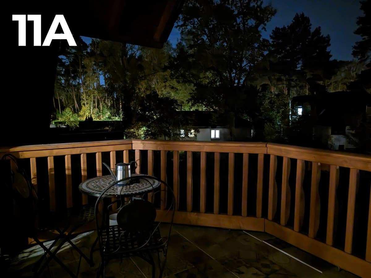 Zum Aufwärmen geht’s mit der wohl einfachsten Übung los: ein Foto bei Tageslicht mit der Hauptkamera. Zwar gibt es mit den dunklen Büschen im Hof ein paar starke Kontraste, doch allgemein sind hier weder der Dynamikbereich noch die Lichtverhältnisse eine Herausforderung – auch wenn die Fotos allesamt etwa 15 Minuten vor Sonnenuntergang entstanden sind.