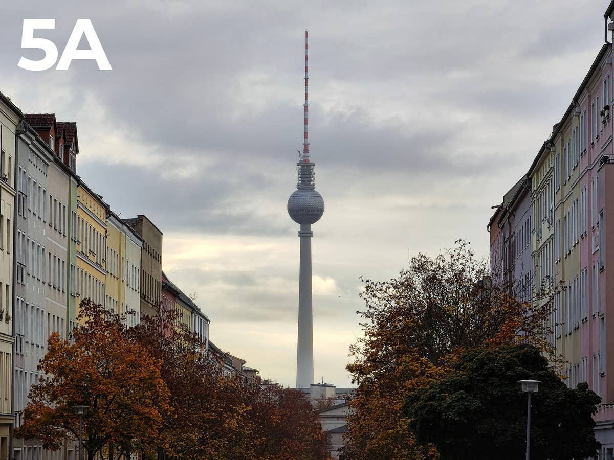 Fünftes Motiv, Fünffach-Zoom: Welches Smartphone hat hier den Berliner Fernsehturm am besten abgelichtet? Zumindest auf dem Papier dürften es das iPhone 14 Pro Max und das Galaxy S22 Ultra hier am schwersten haben, bieten Xiaomi und Google diese Brennweite doch nativ mit ihrer Periskop-Kamera an. Aber ist hier wirklich ein Unterschied erkennbar?