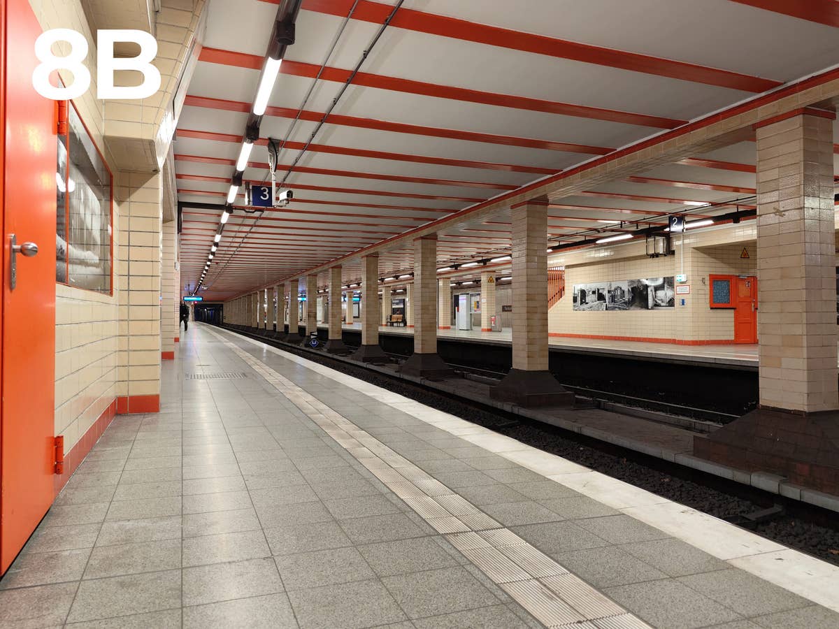 Im Berliner Untergrund müssen sich die vier Smartphones bei fiesem Neonlicht beweisen. Welches der vier Geräte zeigt am Nordbahnhof die beste Bildqualität: iPhone 14 Pro Max, Galaxy S22 Ultra, Pixel 7 Pro oder Xiaomi 12S Ultra?