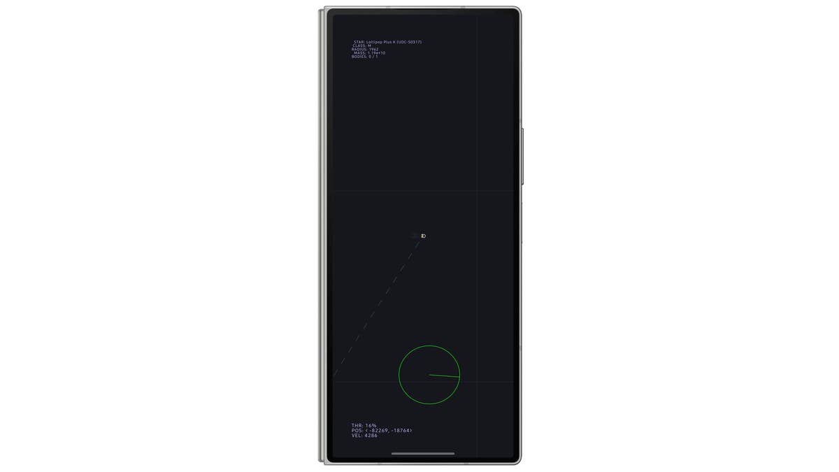 In Android 15 gibt es das gleiche Weltraum-Minispiel „Landroid“ wie in Android 14, aber mit Verbesserungen und neuen Funktionen. Ihr steuert ein Raumschiff, indem Ihr mit dem Finger über den Bildschirm zieht und nach Planeten sucht, auf denen Ihr landen könnt. Die Koordinaten des nächstgelegenen Planeten werden zusammen mit dem Prozentsatz deiner Triebwerke und deiner Geschwindigkeit in der unteren linken Ecke angezeigt.