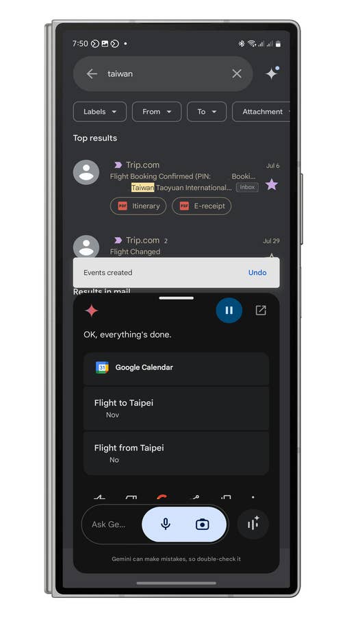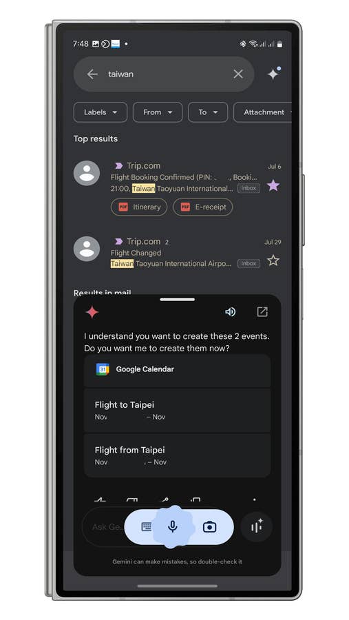 Gemini lässt sich nahtlos in Google Apps integrieren und erleichtert so die Verwaltung von Aufgaben. So könnt Ihr zum Beispiel Flugdetails aus Google Mail extrahieren und sie als Ereignisse in Eurem Google Kalender hinzufügen.