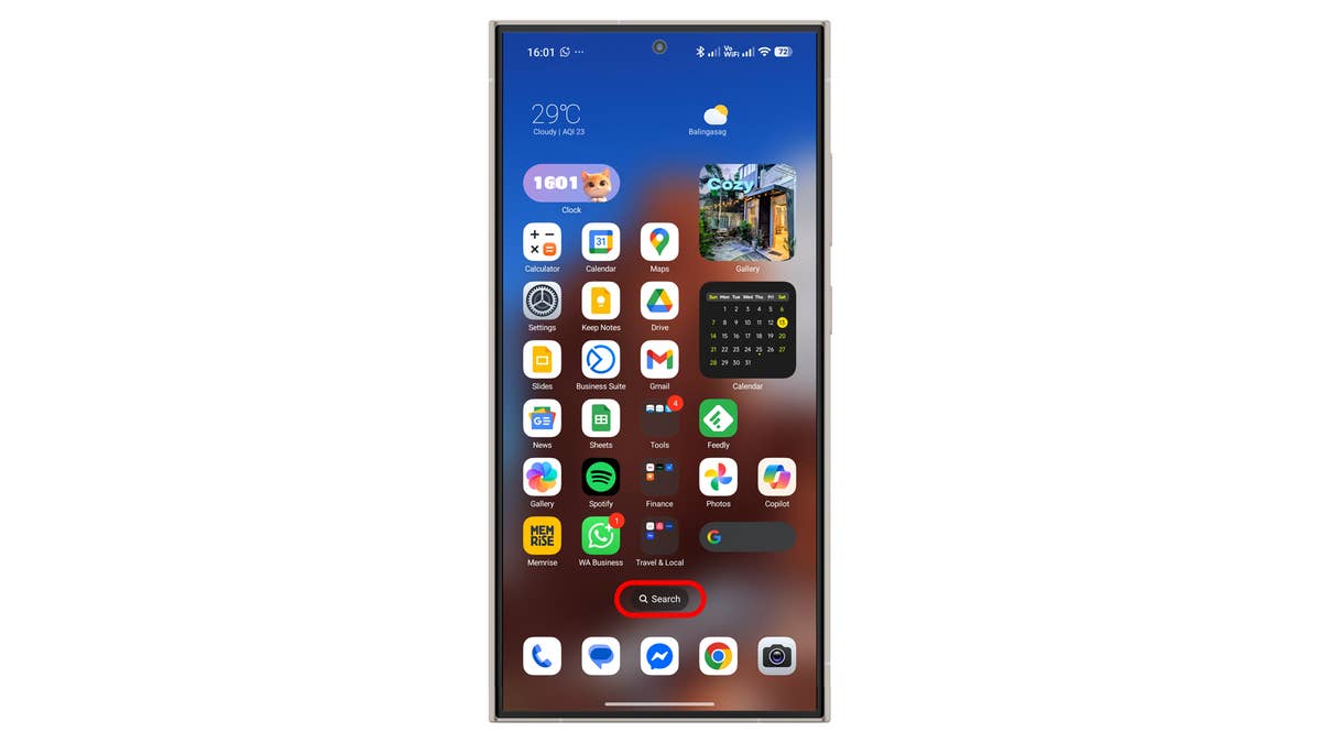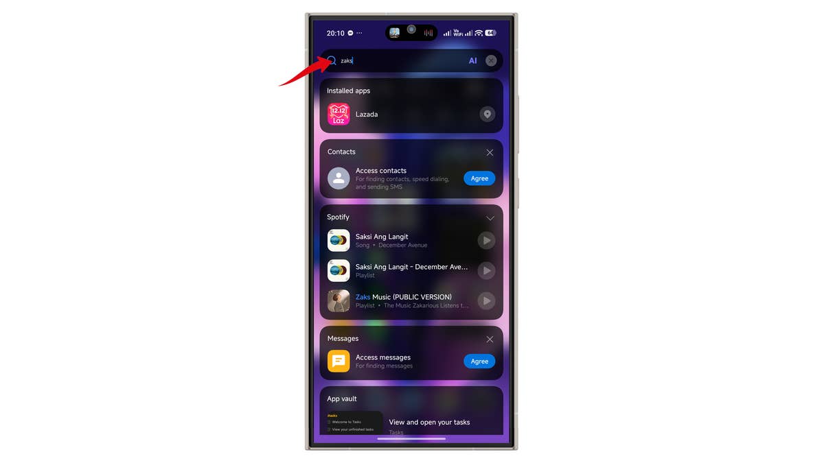 Die Suche auf dem Startbildschirm funktioniert als universelle Suche nach Apps, Kontakten, Medien und Dateien. Sie enthält auch eine Verknüpfung, um KI-Antworten zu erhalten, wenn Sie Fragen eingeben.