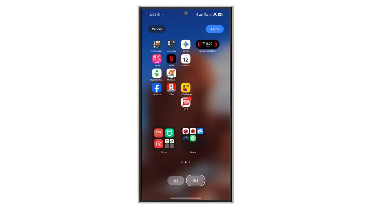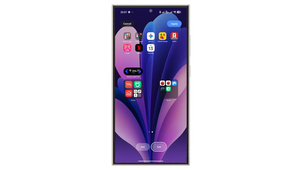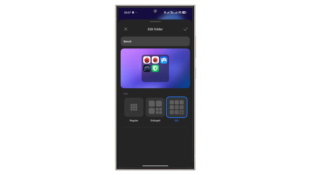 Dank des neuen 5×8-Layouts können mehr Apps auf dem Startbildschirm untergebracht werden. Das bedeutet mehr Platz für Apps und Widgets. Ordner gibt es jetzt in den Größen XXL, Groß und Normal, die alle das direkte Starten von Apps ohne Öffnen des Ordners ermöglichen.