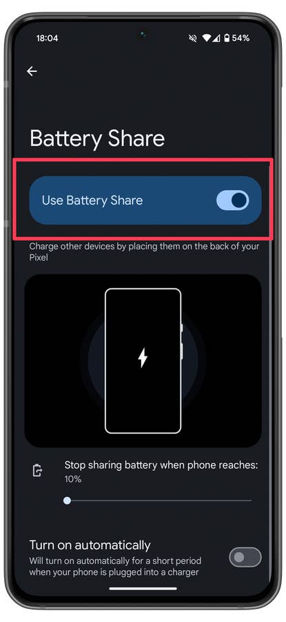 Ihr könnt festlegen, wie viel Energie euer Pixel-Telefon an das andere Gerät abgeben kann, um zu verhindern, dass euch der Akku ausgeht. Wir empfehlen, die Option auf einen höheren Wert als die standardmäßigen 10 Prozent einzustellen.