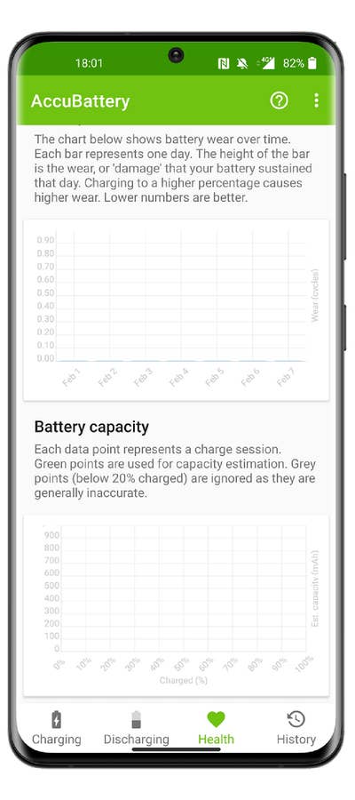 Je öfter Ihr AccuBattery nutzt, desto genauer wird die App bei der Analyse Eurer Batterieleistung. AccuBattery hat vier Tabs: Aufladen, Entladen, Gesundheit und Verlauf. Wenn Ihr Euer Handy aufladet, schätzt AccuBattery die Ladekapazität. Durch den Vergleich mit der „offiziellen“ Ladekapazität, die Ihr manuell eingeben müsst, kann AccuBattery den Zustand Eures Akkus bestimmen.