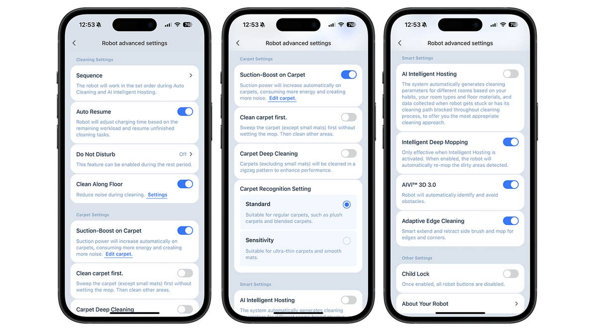 Besonders gut gefällt mir die Funktionsvielfalt, wenn es um das Kartenmanagement geht. Hier ist der Hersteller auf Roborock- und Dreame-Niveau. Der Roboter kann entlang der Bodenverlegerichtung reinigen, was Kratzer auf dem Boden verhindern soll. Insbesondere auf Teppichen spielt die Ecovacs-Home-App ihre Stärken aus. In der App gibt es drei Einstellungen, um die Teppichreinigung auf das nächste Level zu bringen. Da wären:
