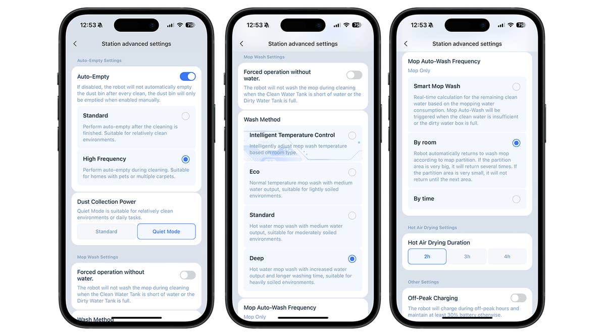 Wie schon erwähnt, bietet die App vier Saugstufen und 50 Wasserdurchflussraten. Im ersten Moment habe ich mich gewundert, weil die „Nur Wischen“-Funktion nicht vorhanden ist. Aber das ist nicht tragisch, da ich jedem empfehle, die Wohnung erst saugen zu lassen, bevor ans Wischen gedacht werden sollte.