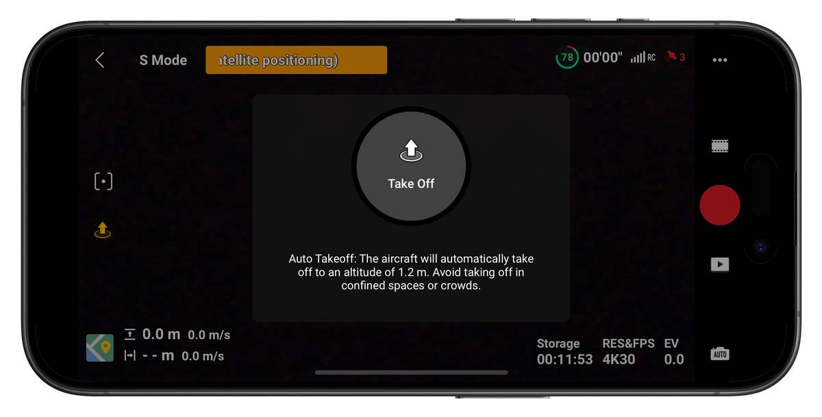 Über die obere Taste könnt Ihr jetzt zwischen einem von sechs Flugmodi wählen, repräsentiert durch die kleinen Symbole. Der sechste Modus ist ein „Custom Slot“, den Ihr mit einem von gegenwärtig drei weiteren Modi belegen könnt. Ein längerer Druck auf den Auswahlmodus löst dann den Startvorgang aus: