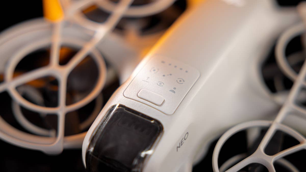 Oben auf der DJI Neo findet Ihr zwei Tasten, vier runde und eine langgezogene LED sowie sechs beleuchtete LED-Piktogramme. Mehr braucht es auch nicht, um die Drohne zu steuern. Durch ein Antippen und anschließendes Drücken und Halten der unteren Taste schaltet Ihr die DJI Neo ein, wobei Euch die fünf LED-Indikatoren den Akkustand anzeigen.