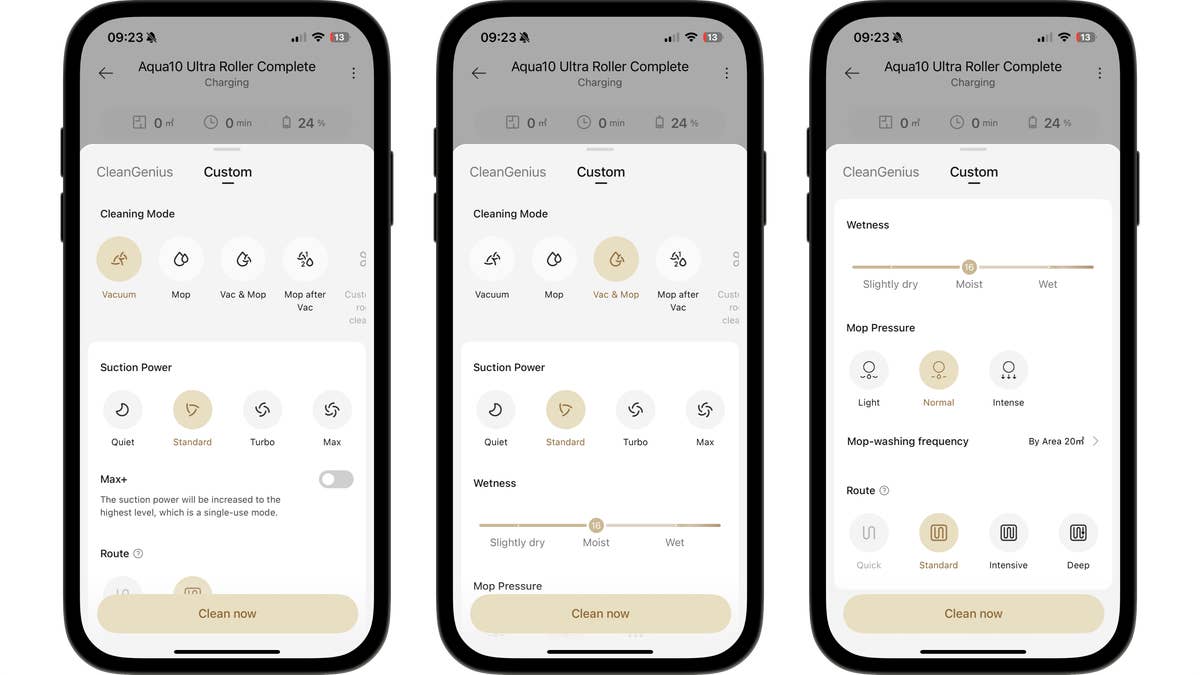 Die Dreame-Home-App gehört zu den funktionsreichen auf dem Markt. Kein Hersteller bietet für Saugroboter so viele Funktionen in der Software wie Dreame. Für den Aqua10 Ultra Roller stehen Euch 4 Saugstufen (5, wenn der Roboter im „Nur Saugen“-Modus ist) und 3 Stufen des Wasserdurchflusses zur Verfügung. Darüber hinaus gibt Euch der Hersteller die Möglichkeit, die Wischfunktion detaillierter einzustellen. Um genau zu sein, könnt Ihr den Mopp-Druck anpassen. Hierfür bietet Euch die App drei Stufen.