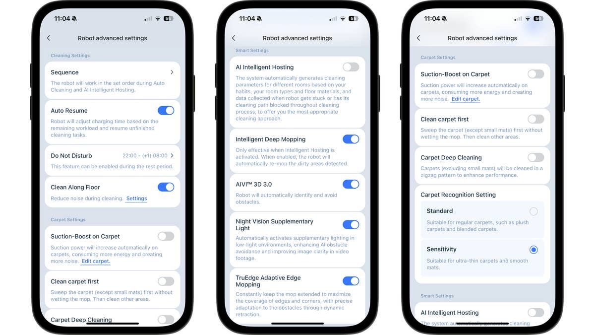 Auf Teppichen zeigt sich der Roboter ebenfalls stark. Die Saugleistung ist minimal geringer als auch auf glatten Oberflächen, was für Saugroboter für gewöhnlich der Fall ist. Dass Ecovacs auf eine erweiterbare Seitenbürste verzichtet, überrascht dann doch – immerhin reden wir hier von einem 1.200 Euro teueren Saugroboter. Tatsächlich ist das Reinigungsergebnis besser als erwartet. Partikel wie Haferflocken bekommt er problemlos aus Ecken heraus. Kunden brauchen sich keine Sorgen zu machen, dass das Reinigungsergebnis in Ecken und schwer zugänglichen Flächen aufgrund der fehlenden Erweiterungsmöglichkeit abnimmt.