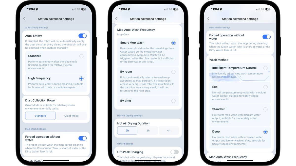 Ebenfalls im Startmenü werden die Funktionen des Docks gesteuert. So könnt Ihr jederzeit die Walzenwäsche, Walzentrocknung und die Absaugfunktion aktivieren. In den erweiterten Einstellungen könnt Ihr für alle genannten Anpassungen, detailliertere, besser auf Eure Wohnung abgestimmte Einstellungen vornehmen. Zu den weiteren Anpassungen gehören Zeitpläne. Hier legen Nutzer feste Tage und Uhrzteiten fest, an denen geputzt werden sollen. Gut gefällt mir, wie detailliert ich die Reinigung für jeden Raum separat individualisieren kann.