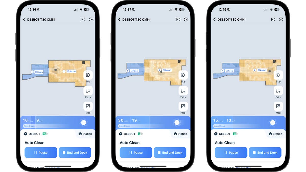 Die Einrichtung des Roboters geht schnell. Scannt den QR-Code, der sich unter der Haube befindet. Jetzt noch mit der E-Mail anmelden und die neueste Firmware herunterladen – und startklar ist der Ecovacs Deebot T80 Omni. Das Mapping absolviert der Sauger makellos. Die gescannte Karte ist präzise. Positiv fällt schon hier auf, dass der Roboter im Weg befindliche Gegenstände rechtzeitig erkennt. Im Nachgang können Nutzer die Karte nach Belieben verfeinern. Ihr könnt Möbel hinzufügen, Räume umbenennen und den Bodentyp für jeden Raum festlegen.