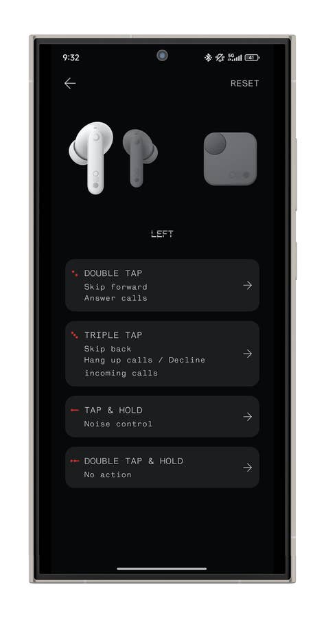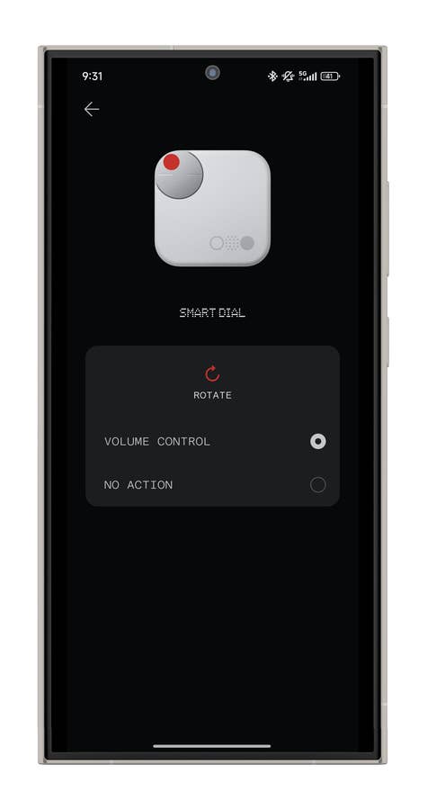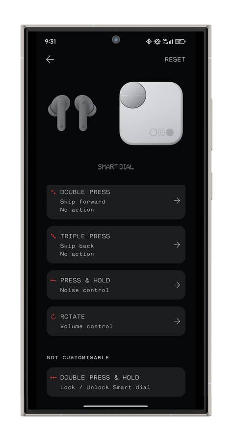 Insgesamt kann dieses Rad fünf Arten von Befehlen erkennen. Am nützlichsten ist es, es in die eine oder andere Richtung zu drehen, um die Lautstärke zu regeln. Abgesehen vom Drehen kann man es auch drücken für Pause/Play – ein genialer Schachzug von Nothing. Aber man kann auch fast alle Befehle zuweisen, die normalerweise den Kopfhörern vorbehalten wären.
