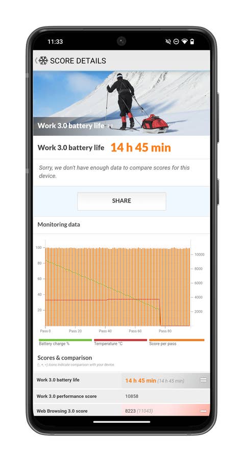 In unserem Akkulaufzeit-Benchmark hielt das CMF Phone 1 insgesamt 14 Stunden und 45 Minuten durch, bevor es auf weniger als 20 % Akkuleistung kam. Das ist ein hervorragendes Ergebnis. Im realen Gebrauch und bei einer durchschnittlichen Bildschirmzeit von 3 Stunden konnte ich zwei Tage ohne Probleme durchhalten, bevor ich das Smartphone aufladen musste.