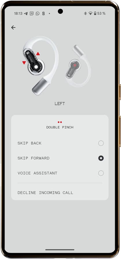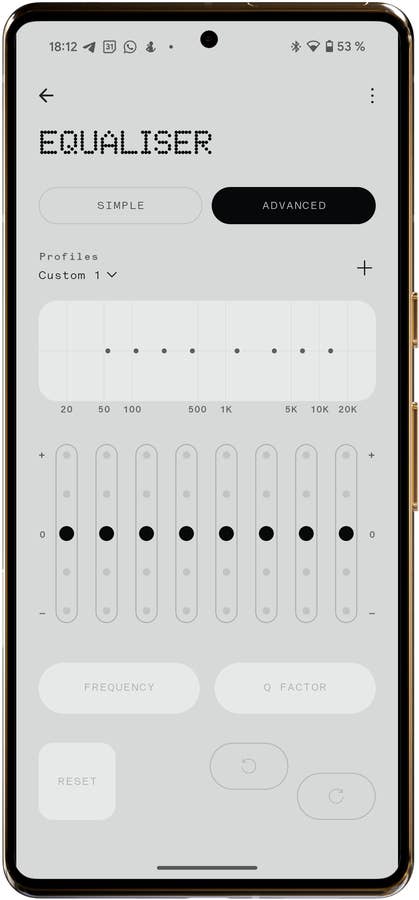 Mit dem Release ihrer Ear (2) im letzten Jahr hat Nothing einen erweiterten Equalizer für ausgewählte Kopfhörer gelauncht. Erfreulicherweise ist dieser mit den Ear (open) kompatibel. Auf Wunsch könnt Ihr dabei einen 8-Band-Equalizer feinjustieren und sowohl in der Lautstärke als auch in der Breite des Frequenzbereichs jedes einzelnen Bandes (Q-Faktor) anpassen. Ebenfalls frei konfigurierbar sind die Steuerungsmöglichkeiten der Ear (open) – viel mehr Features findet Ihr in der App aber leider nicht.