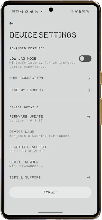Ihr könnt einen Modus für eine geringere Latenz aktivieren und die Dual-Pairing-Funktion steuern. Features wie 3D-Audio oder Spatial Audio fehlen aber leider. Nutzt Ihr ein Nothing-Smartphone, könnt Ihr zudem auf ChatGPT zugreifen und wie eine Art Sprachassistenten nutzen. Wollt Ihr mehr über dieses Feature empfehlen, lest am besten Antoines Testbericht der Ear oder seinen Meinungsartikel zur ChatGPT-Integration von Nothing.