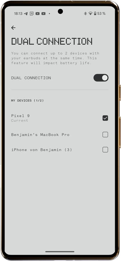 Somit wusste ich im Testzeitraum insgesamt nicht genau, wann ich die offenen Nothing-Kopfhörer gegenüber den sehr guten Nothing Ear (a) vorziehen soll. In lauten Berliner S-Bahnen konnte ich Podcasts oder Musik kaum verstehen. Um zu Hause konzentriert Musik zu hören, reicht die Auflösung der Codecs nicht aus. In beiden Szenarien helfen auch die spannende ChatGPT-Unterstützung und Nothings fantastische Equalizer nicht wirklich weiter.