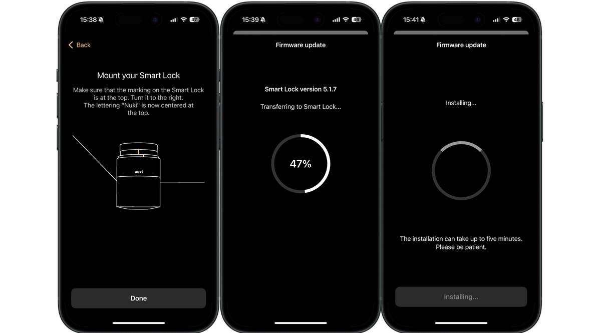 Nachdem die Platte angebracht wurde, wird der Schlüssel reingesteckt und das Smart Lock draufgesetzt. Jetzt noch ein Firmware-Update und fertig – Das Nuki Smart Lock Pro ist einsatzbereit. Die Installation hat mich im Praxistest etwa fünf Minuten gekostet.