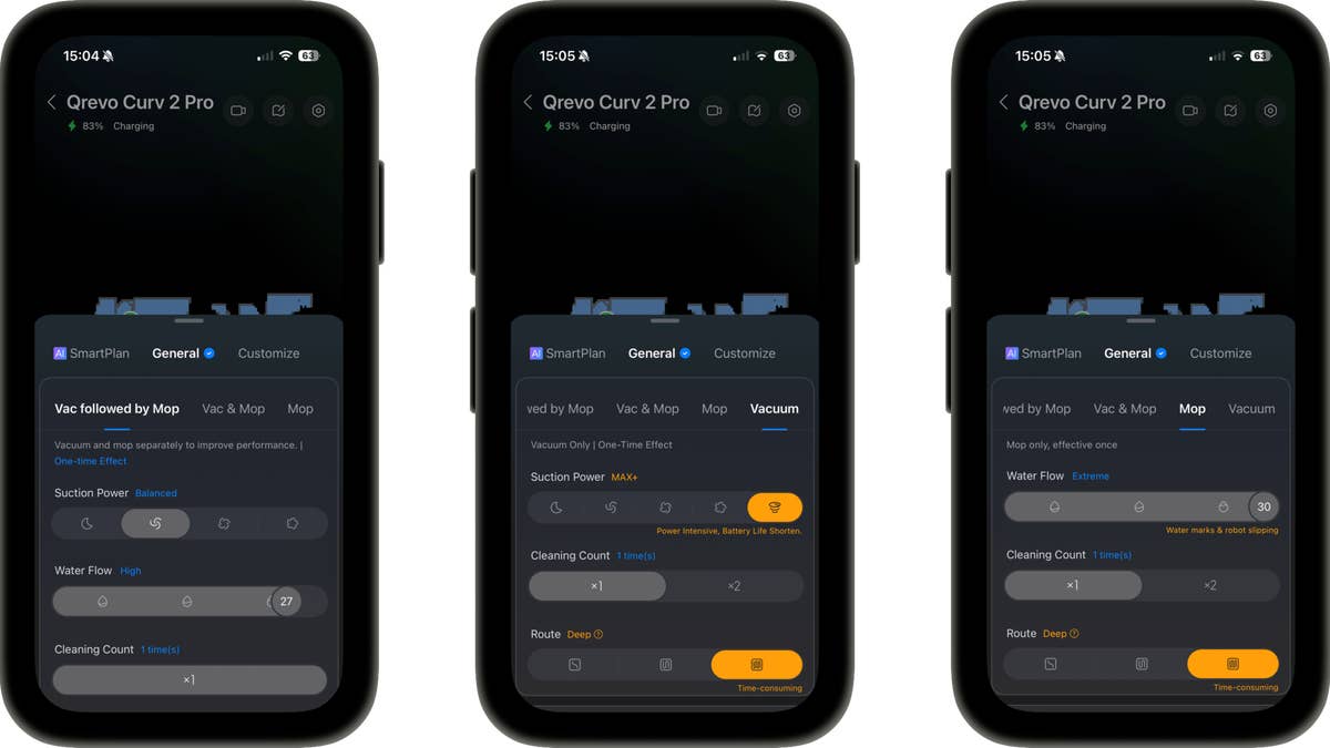 Die Roborock-App gehört zu den funktionsreichsten auf dem Markt. Ihr habt die Wahl zwischen 4 Saugstufen (5, wenn der Roboter im „Nur Saugen“-Modus ist). Bei den Wasserdurchflussraten stehen Euch 3 Stufen zur Verfügung. Außerdem könnt Ihr festlegen, wie eng der Roboter Bahnen fahren soll.