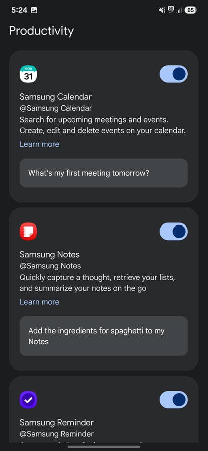 Gemini hat nicht nur Bixby abgelöst, sondern auch Erweiterungen für die Interaktion mit Samsungs Kalender-, Notizen- und Erinnerungs-Apps erhalten. Die Integration kann genutzt werden, um ein Veranstaltungsdatum auszuwählen und eine Erinnerung oder einen Kalendertermin festzulegen.