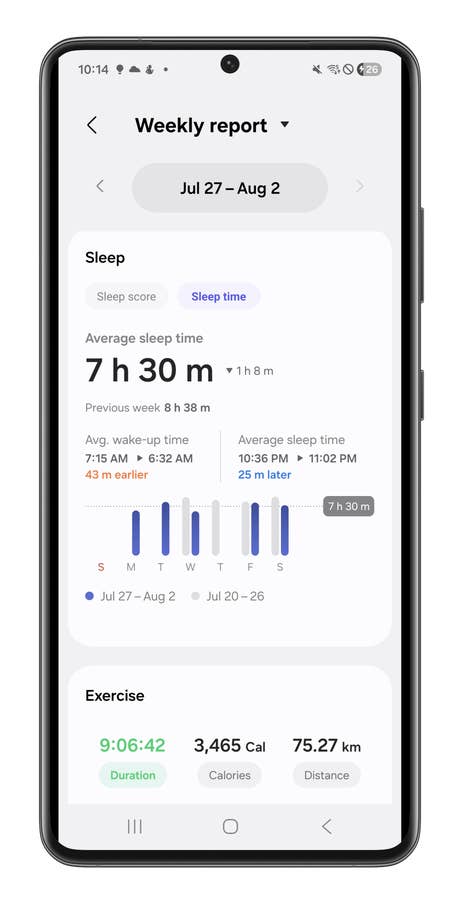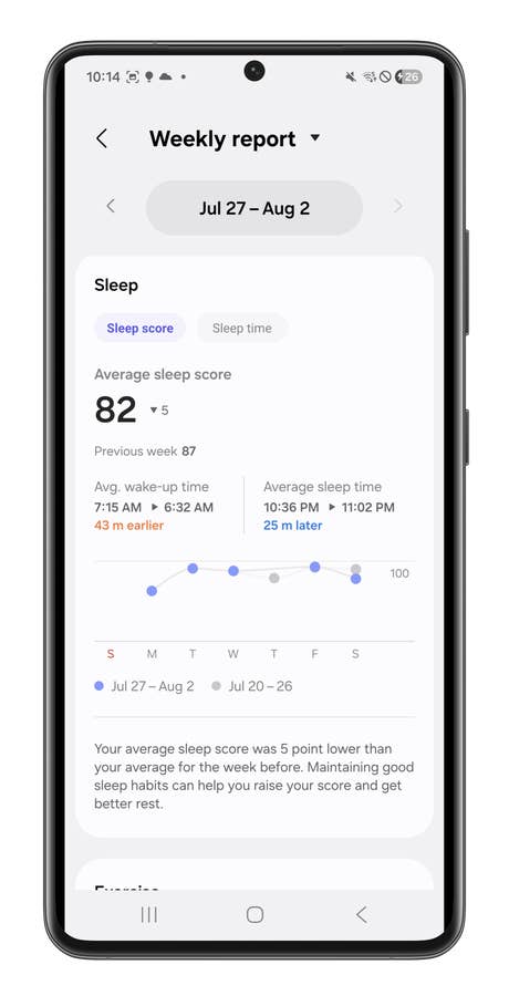 Als ich die Watch 8 Classic zum Schlafen trug, erstellte sie automatisch meinen Ausgangswert. Die wenigen Male, die ich davon abwich, waren meist an Tagen, an denen ich aktiver war und mein Körper mehr Stress hatte. Um ehrlich zu sein, fand ich die Herzfrequenzvariabilität, die Ruheherzfrequenz und die Atemfrequenz – Daten, die ich von Geräten wie dem Whoop MG, dem Oura Ring 4 und dem Amazfit Active 2 erhalte – viel nützlicher, um das zu verstehen.