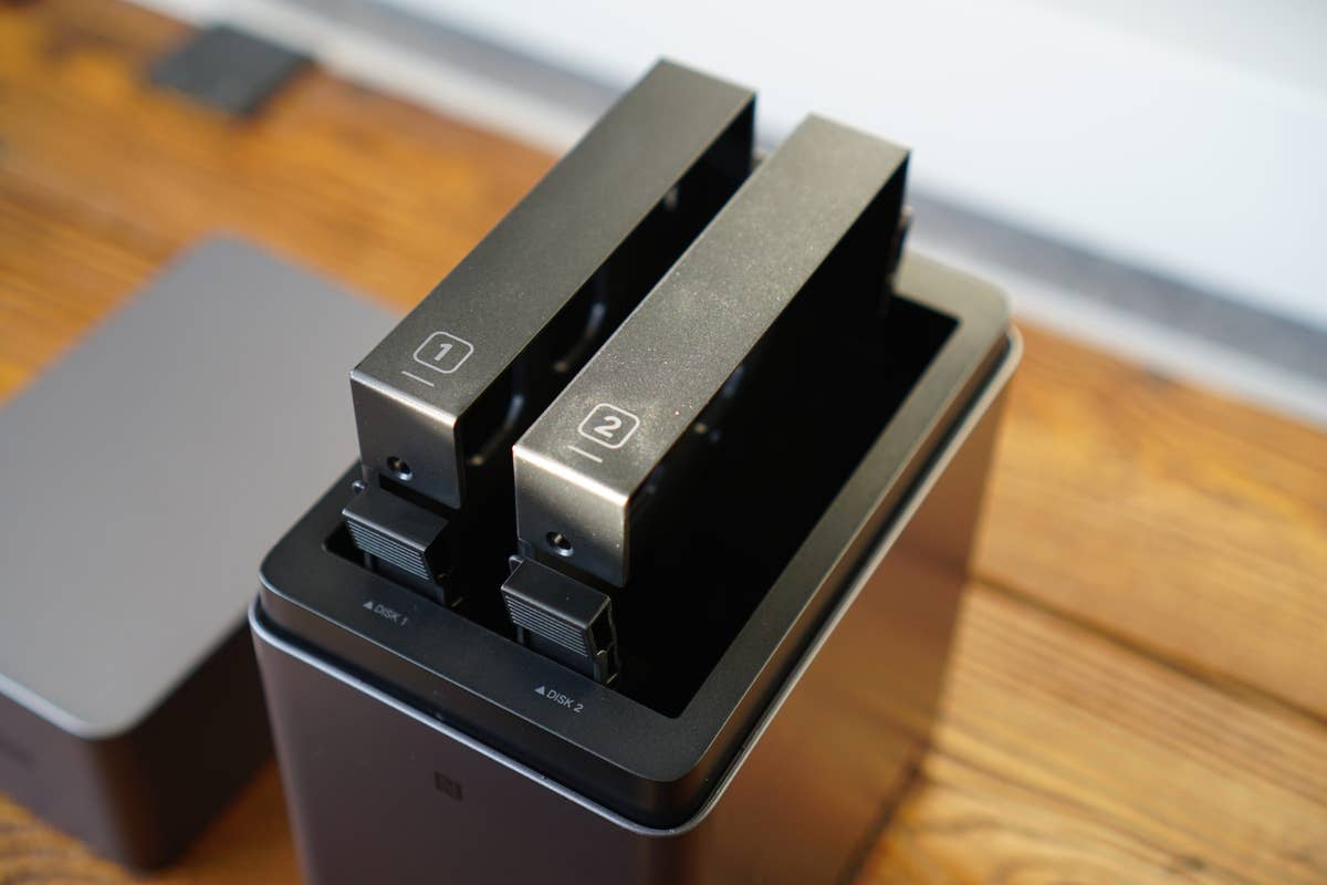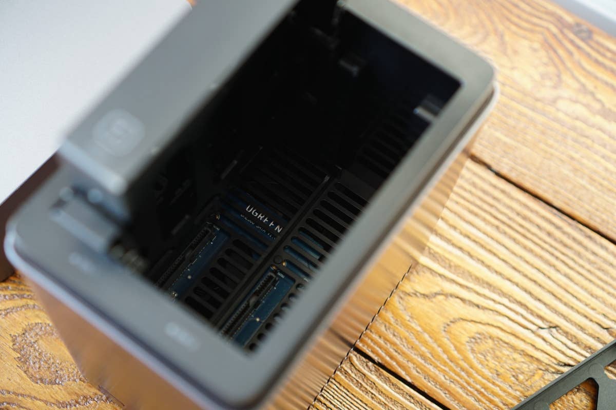 Der Ugreen NASync DH2300 ist handlich, schick und vor allem hervorragend verarbeitet. An dieser Stelle können wir beim besten Willen nichts beanstanden. Zieht man die obere Gehäusekappe ab, offenbaren sich zwei SATA-Laufwerksschächte für bis zu 60 TB Speicher (2 × 30 TB). Allerdings sind die Speichermedien im Kaufpreis nicht enthalten.