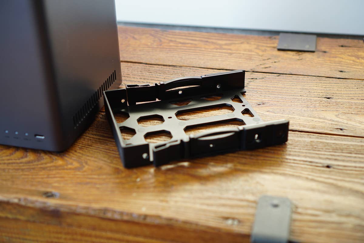 Die Einrichtung gestaltet sich derweil als überaus simpel. Festplatte einsetzen, mittels der mitgelieferten Schrauben befestigen, in das Gehäuse schieben und den magnetischen Deckel aufsetzen. Dann noch den NAS per LAN mit dem Router verbinden, das Netzteil in die Steckdose stecken, fertig. Ganz einfach und unkompliziert.