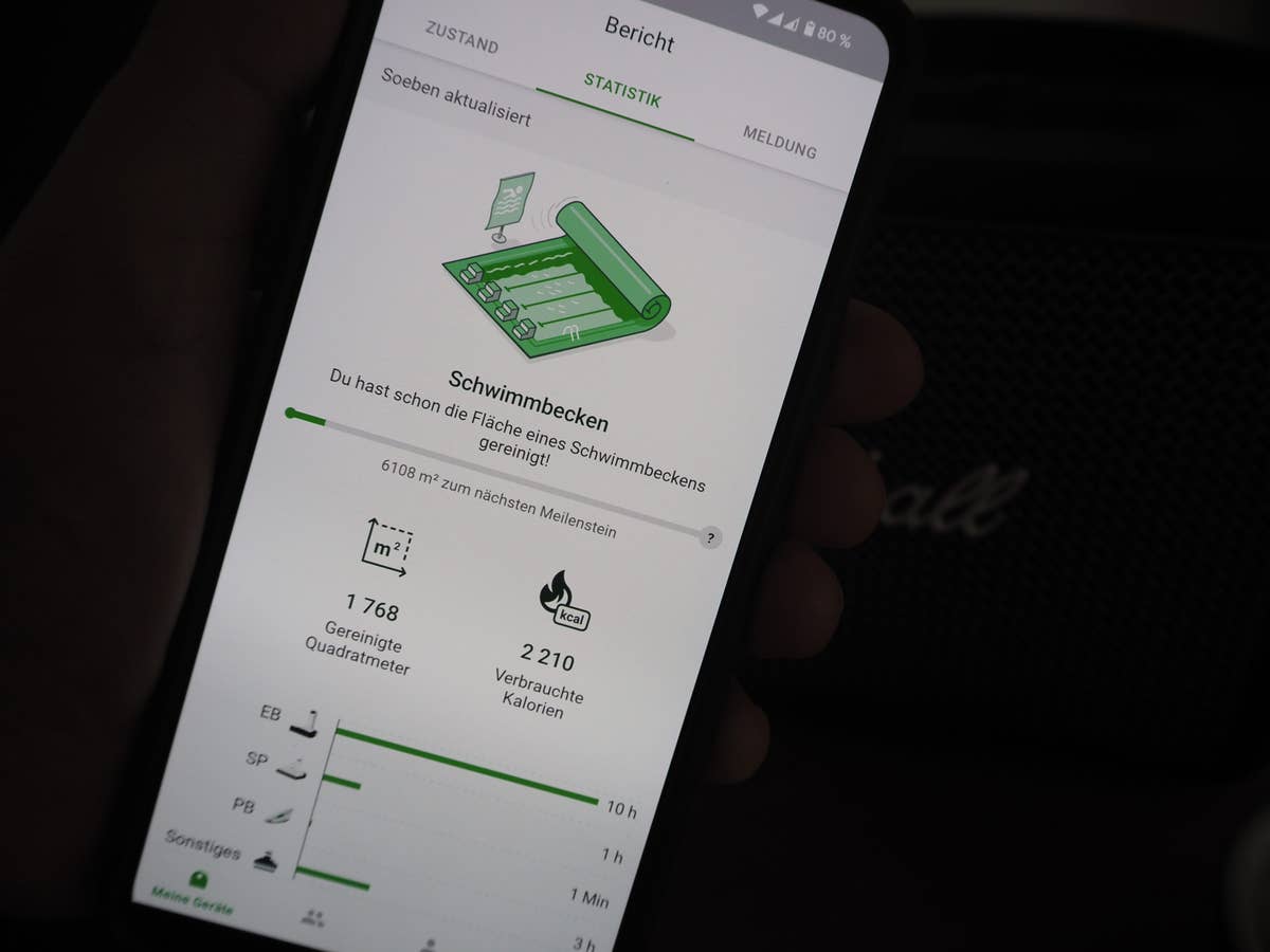 Über den “Statistik”-Reiter der App seht Ihr dann, wie viel Ihr schon gestaubsaugt habt und – kein Scherz – wie viele Kalorien Ihr beim Saugen und Saugwischen schätzungsweise verbraucht habt. Hier ist die Vorwerk-App dann sogar eine waschechte Fitness-App.
